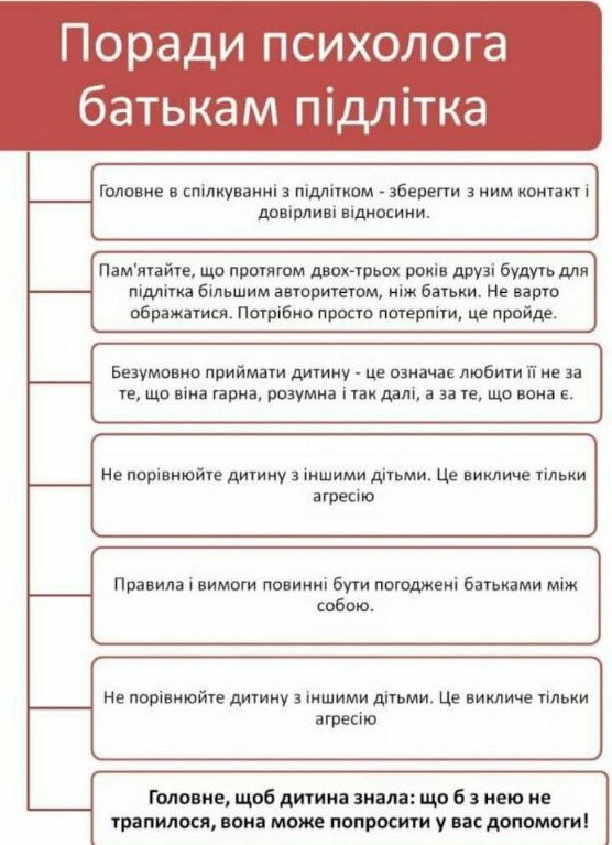 ►Долучати підлітків до допомоги іншим. Це дуже важливо, щоб дитина відчула свою соціальну значимість. Але робити це треба за умов максимальної безпеки для неї. Можна долучатися до допомоги разом з підлітком, так він відчує вашу підтримку і турботу.